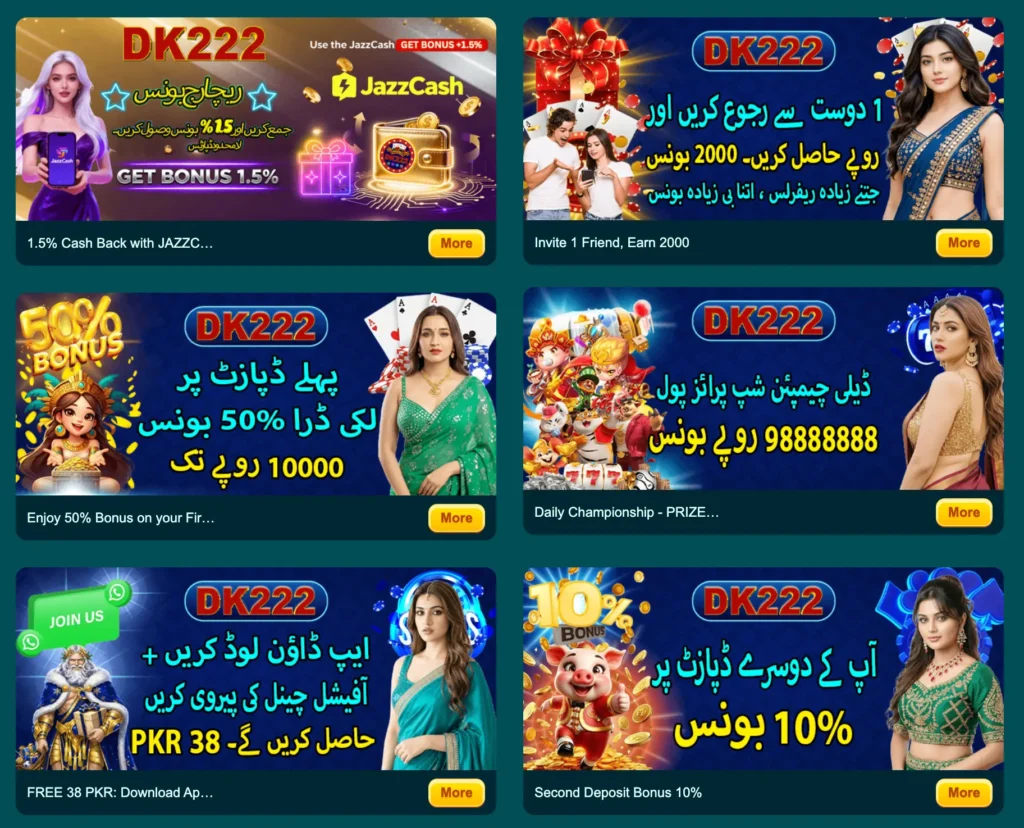 With its smooth performance, user-friendly interface, instant registration, and quick earning system, DK222 APK is rapidly becoming a trending and reliable choice among online gamers in Pakistan. It also offers daily bonuses, promotional rewards, and multiple earning opportunities, making it even more attractive for new users.You can also try 777CB Game.